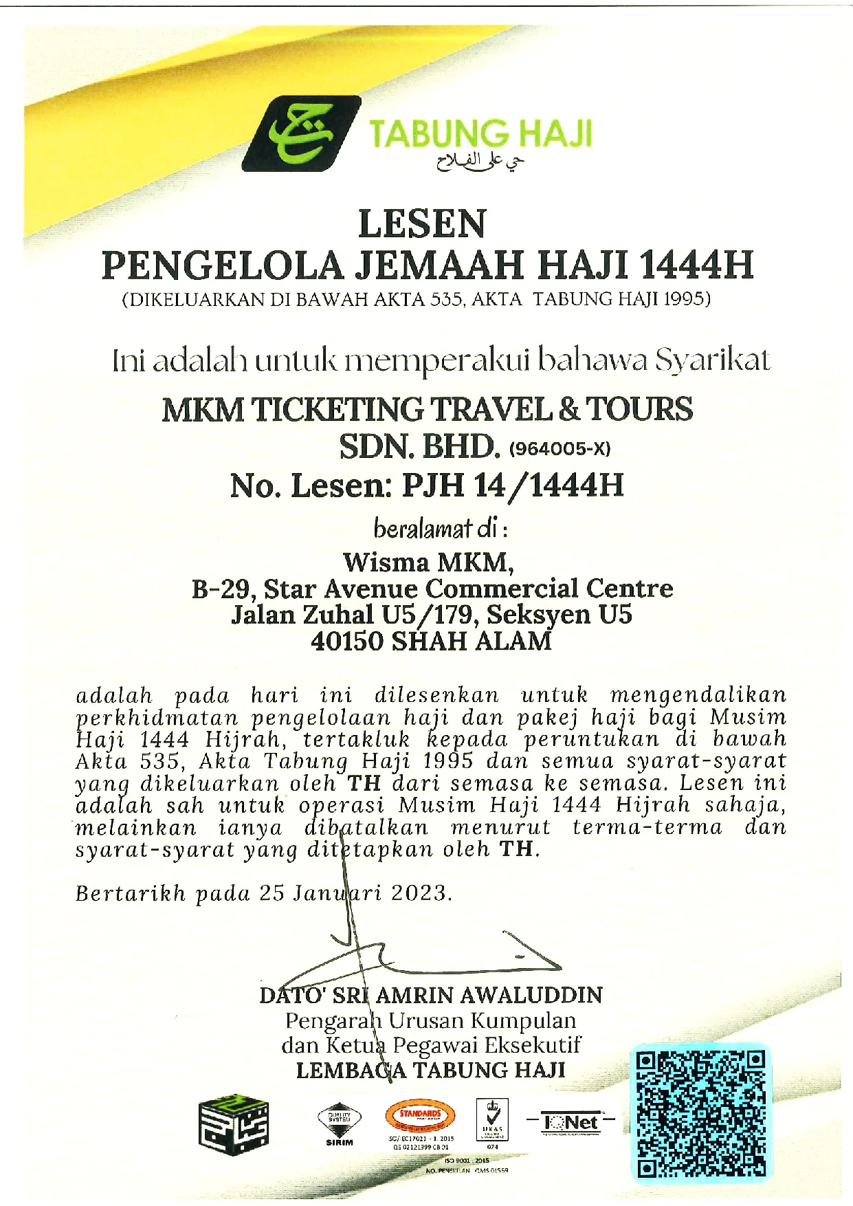 Maintained licenses: Hajj License (PJH14-1440H), Umrah License (KPK/LKU0088).