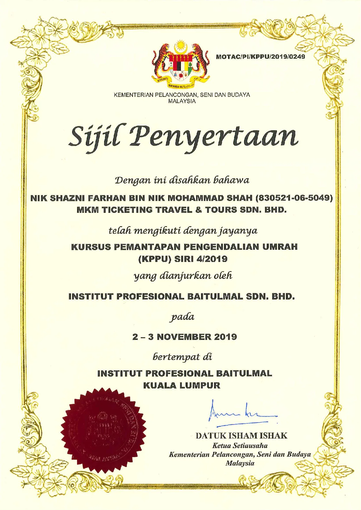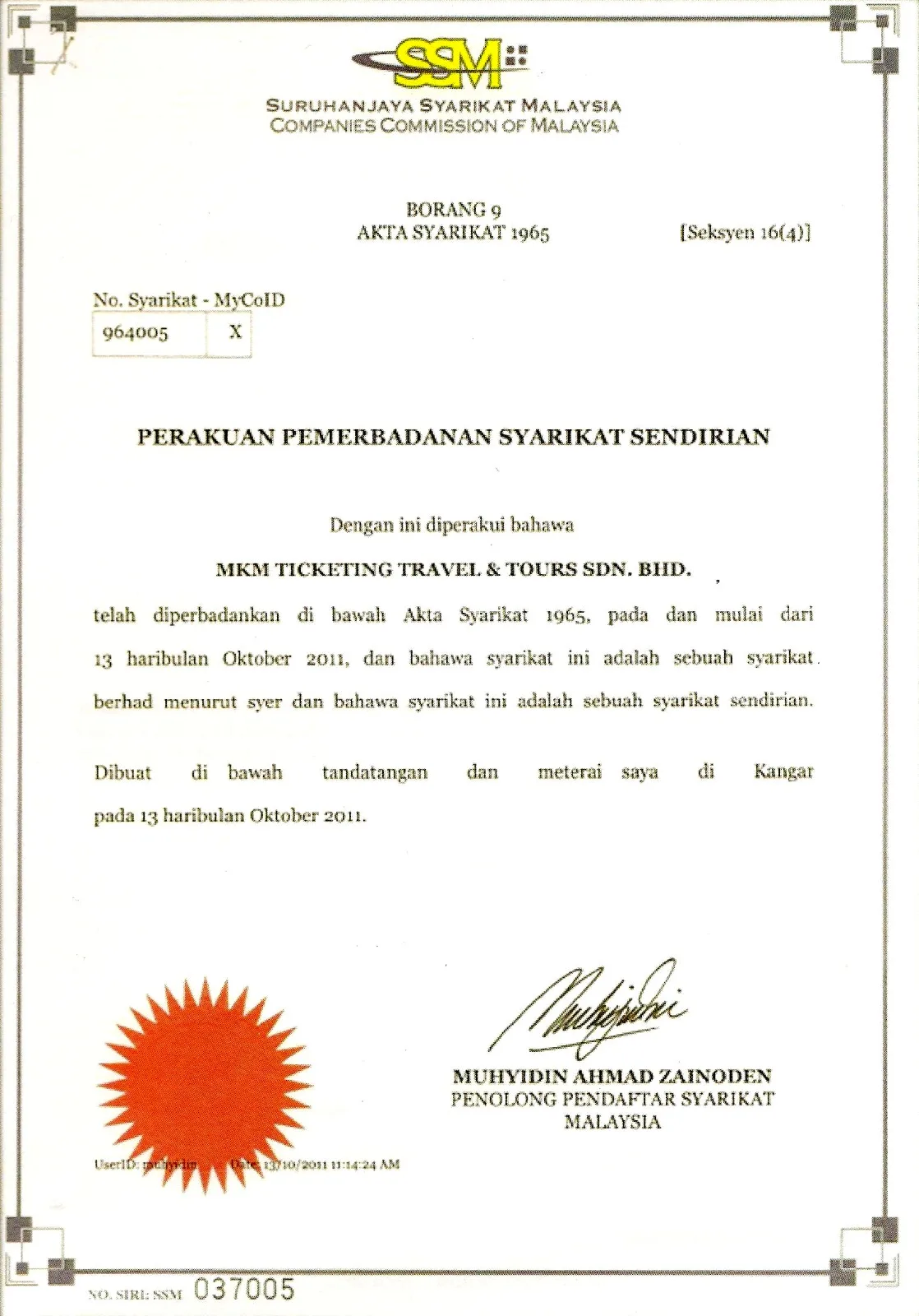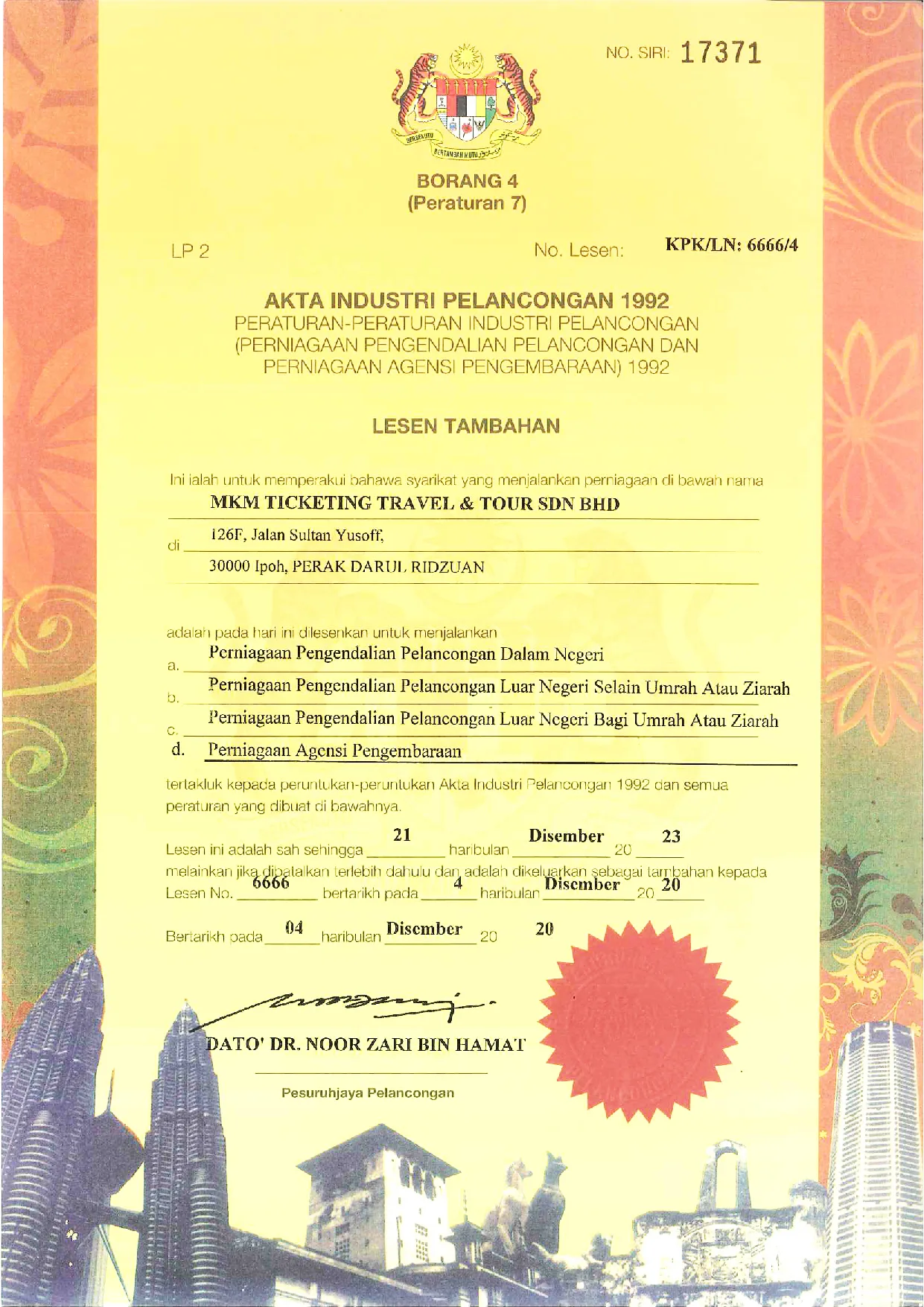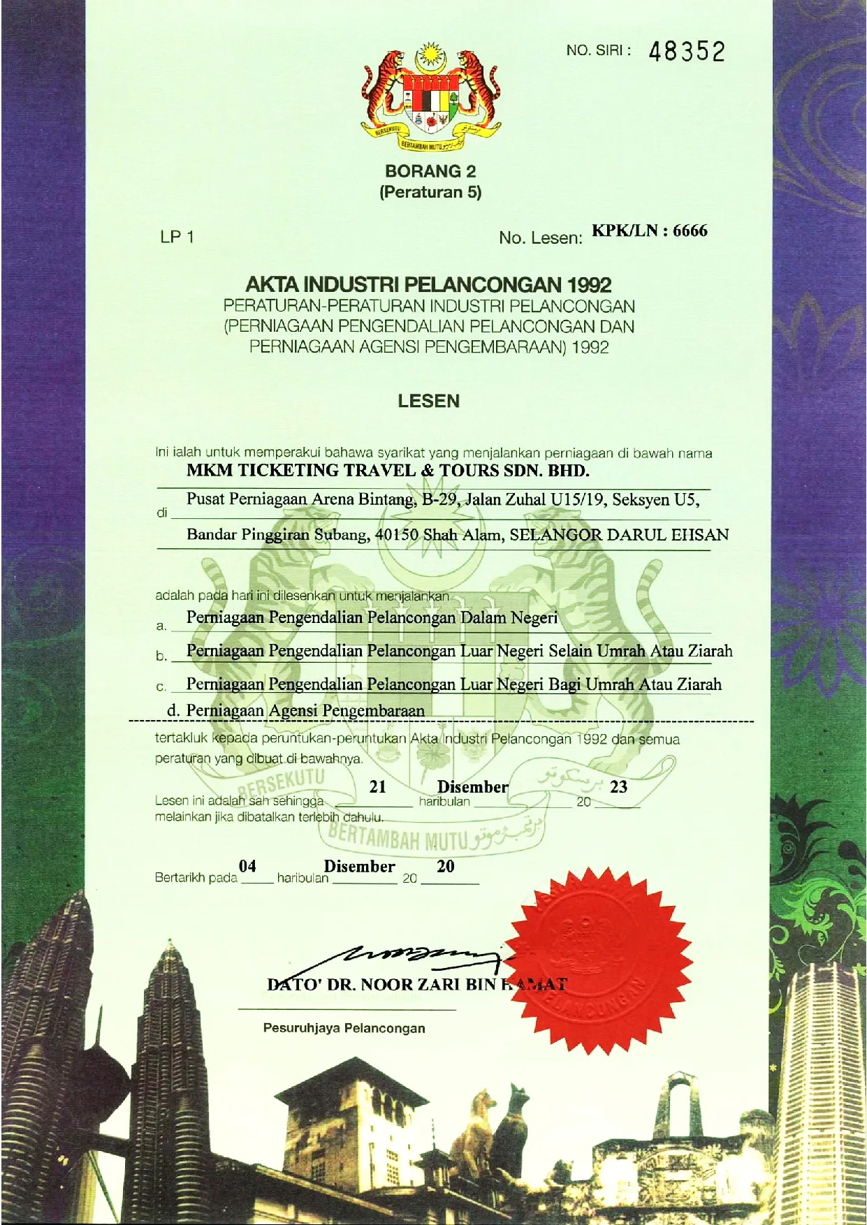 MKM Ticketing Travel & Tours Sdn. Bhd. was officially incorporated & fully licensed by the Ministry of Tourism Malaysia (KPL6666).